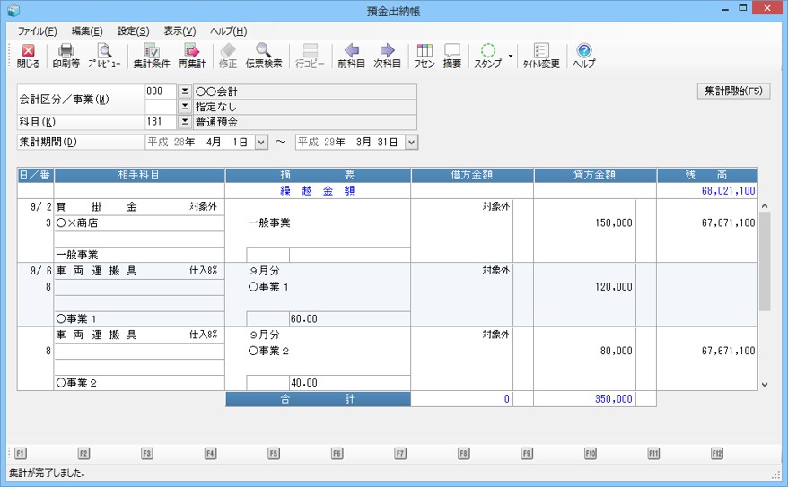預金の出入を勘定科目別にまとめた帳簿を表示・印刷します。仕訳にスタンプを押すこともできます。