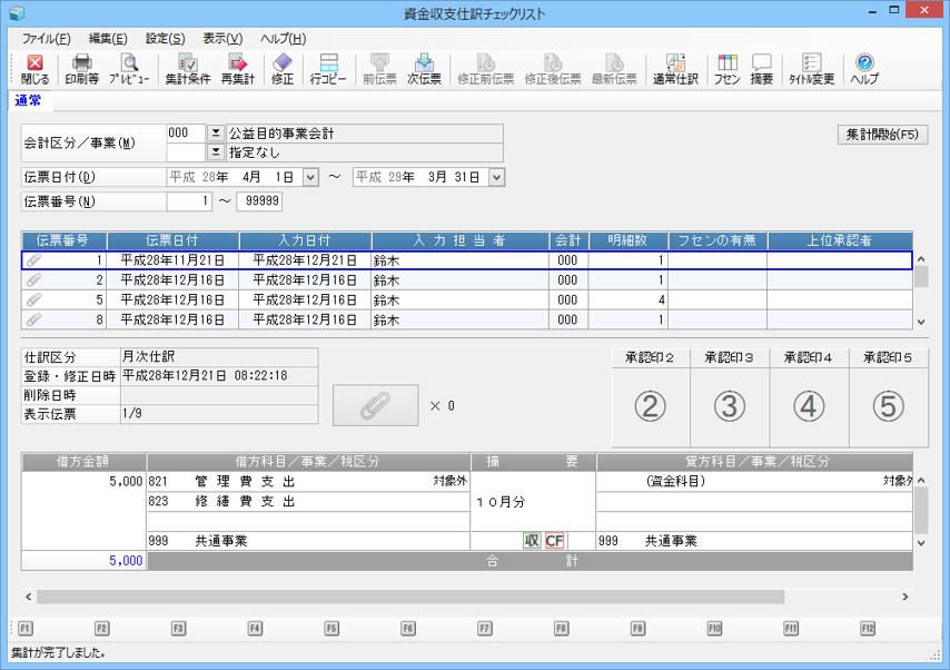 「資金収支仕訳チェックリスト」では、「資金仕訳」を含む伝票が、どのように資金収支の仕訳に変換されているかを出力します。