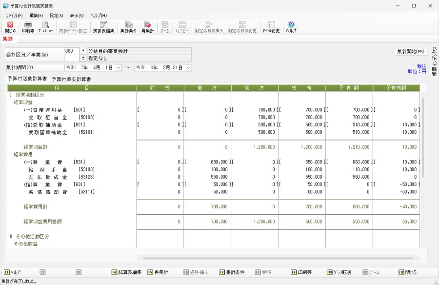 予算付正味財産増減計算書、予算付収支計算書