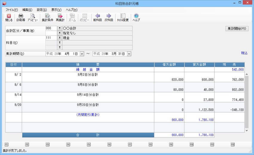 勘定科目(見出し科目・主科目・中科目・小科目)ごとに一日分・一月分の取引の合計額を表示・印刷します。