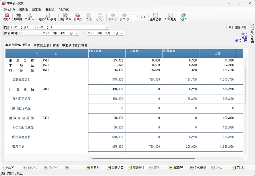 事業または、事業グループごとに発生額、または累計額を集計し、一覧表形式で集計して表示・印刷します。