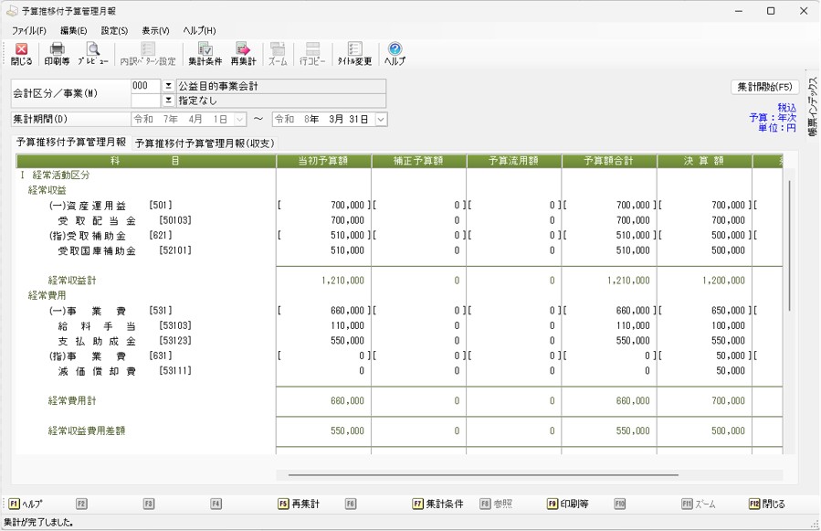 活動(平成20年施行基準の場合は正味)・収支科目 の当初予算額、補正予算額、予算流用額、予算額合計、決算額、差異、率を一覧で表示・印刷します。
