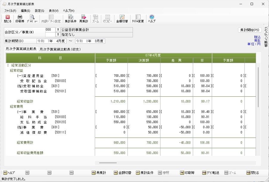 月度ごとに科目の予算額、決算額、差異、率を一覧で表示・印刷します。