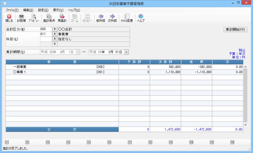 指定された科目の予算データを事業グループ事業)ごとに集計し予算額、決算額、差異、率を表示・印刷します。