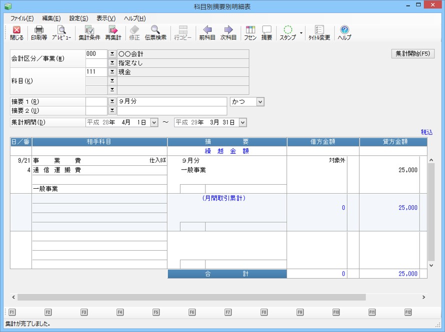メニューの「摘要帳票」-「科目別摘要別明細表」を選択すると、以下のような画面が表示されます。