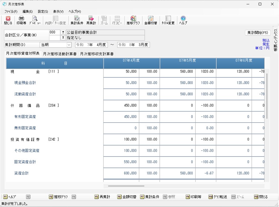 月次推移貸借対照表、月次推移活動計算書、月次推移収支計算書