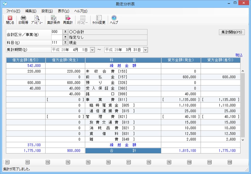 メニューの「分析処理」-「勘定分析表」を選択すると、以下のような画面が表示されます。