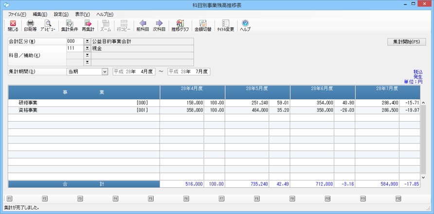 メニューの「分析処理」-「科目別事業残高推移表」を選択すると、以下のような画面が表示されます。