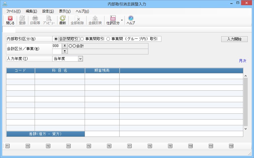 メニューの「内部取引」-「内部取引消去調整入力」を選択すると、以下のような画面が表示されます。
