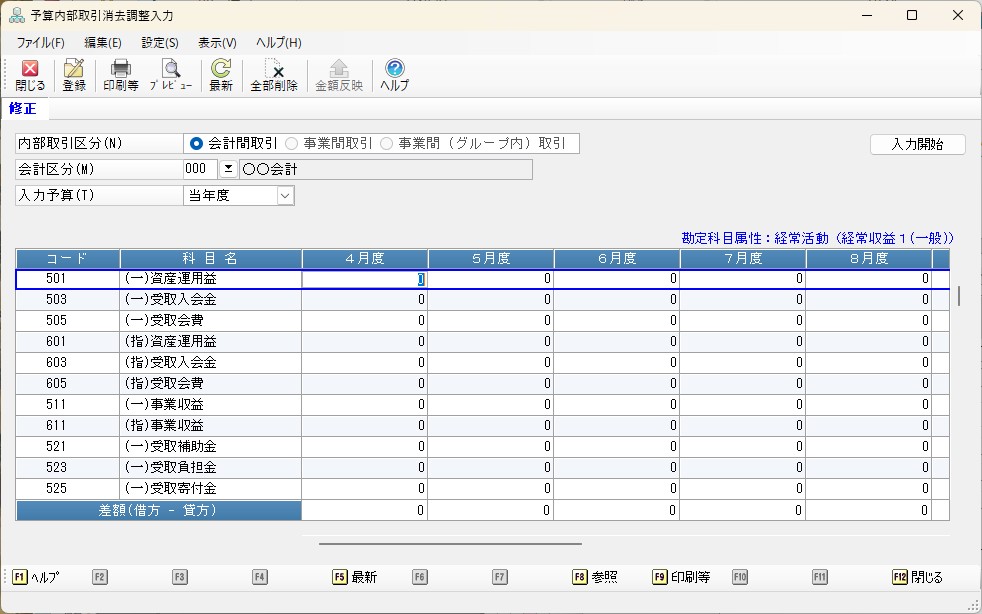 メニューの「内部取引」-「予算内部取引消去調整入力」を選択すると、以下のような画面が表示されます。
