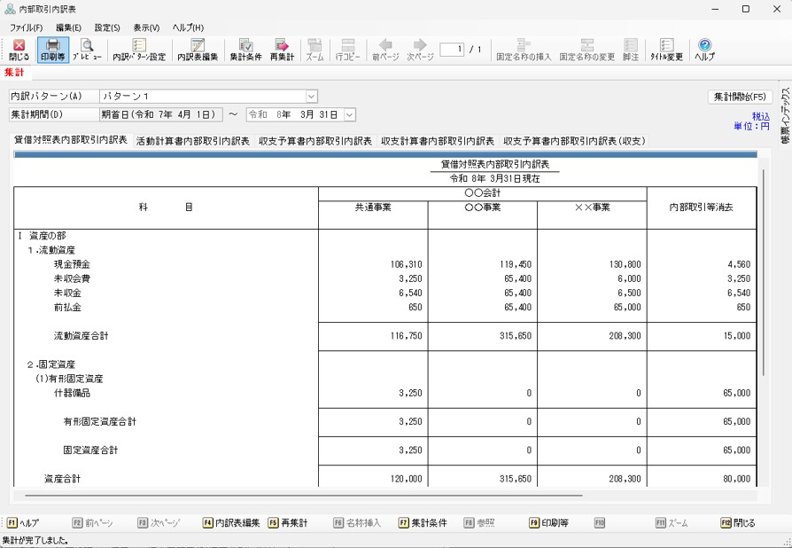 内部取引消去額のみを集計した内訳表を表示・印刷します。