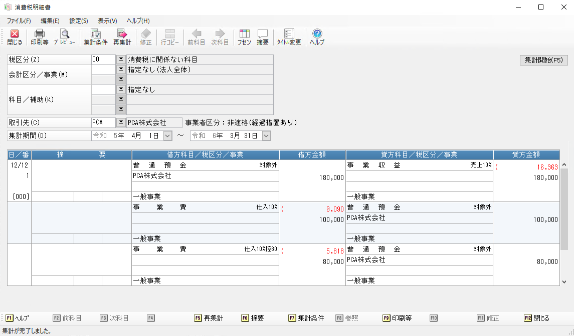 補助科目の事業者区分が[適格]、[非適格(経過措置あり)]、[非適格(経過措置なし)]が集計対象になります。事業者区分が[その他]の補助科目は集計対象ではありません。