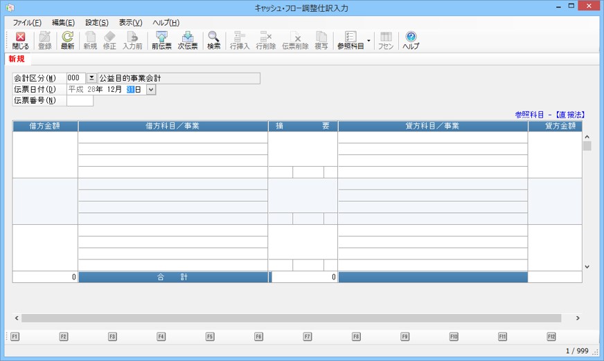 メニューの「決算処理」-「キャッシュ・フロー」-「キャッシュ・フロー調整仕訳入力」を選択すると、以下のような画面が表示されます。