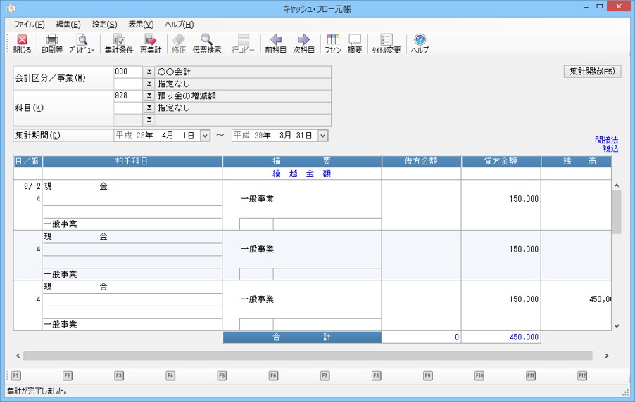 キャッシュ・フローの増減を勘定科目別にまとめた帳簿を表示・印刷します。