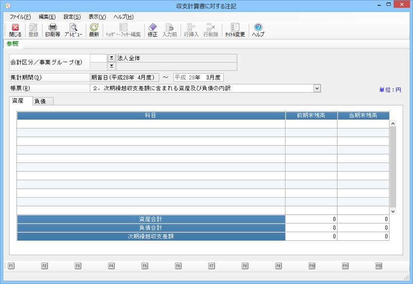 法人全体、会計区分別、管理グループ別、事業グループ別、事業別で収支計算書に対する注記の編集、及び出力を行います。