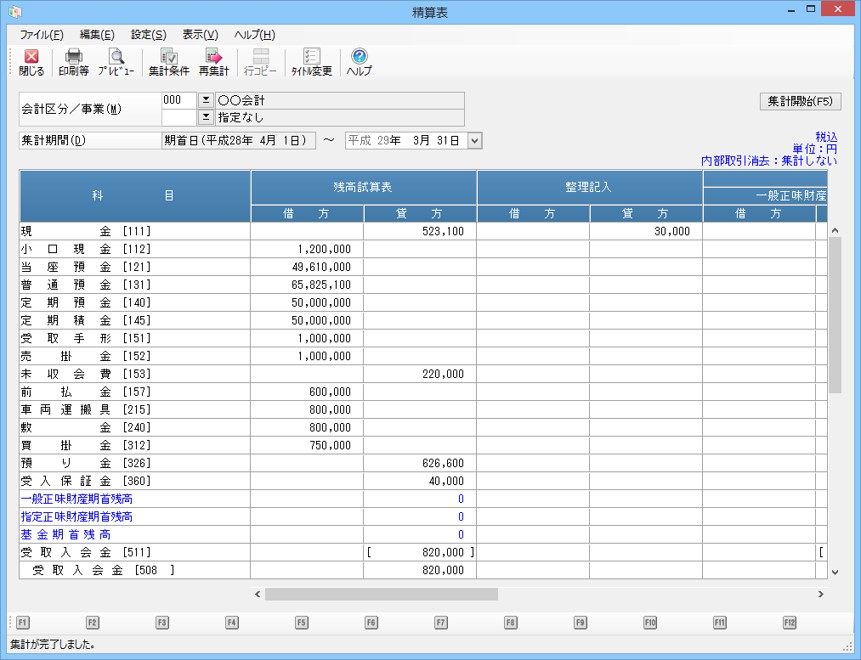 残高試算表から始まり、決算整理を加味し、正味財産増減、貸借対照表に至るまでの金額を一覧で表示・印刷します。
