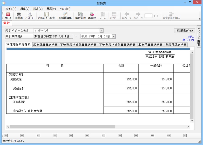 メニューの「決算処理」-「総括表」を選択すると、以下のような画面が表示されます。