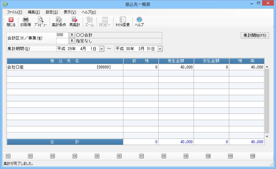 振込先ごとに仕訳データを集計し前残、発生金額、支払金額、残高を表示・印刷します。