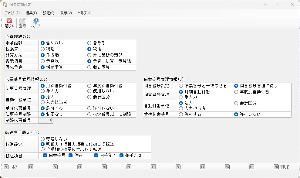 メニューの「伺書」-「伺書初期設定」を選択すると、以下のような画面が表示されます。