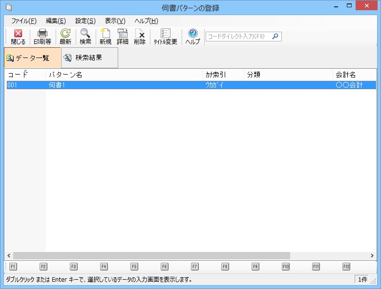 メニューの「伺書」-「伺書パターンの登録」を選択すると、以下のような画面が表示されます。