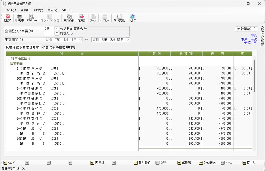 活動(令和7年施行基準以外の場合は正味)・収支科目 の予算額、決算額(伺書金額を含む)、差異、率を一覧で表示・印刷します。