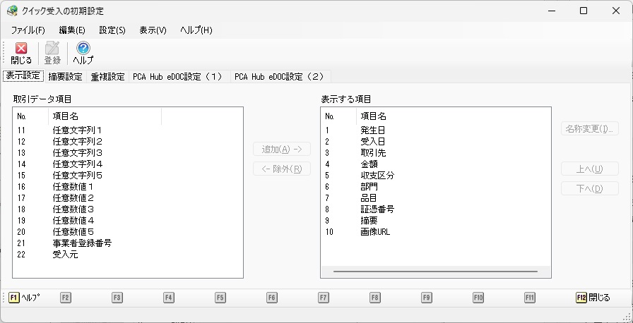 取引データの表示設定、仕訳に入力する摘要文の設定、重複データのチェック設定、取引データと『PCA Hub eDOC』のプロパティとの関連付けを行います。