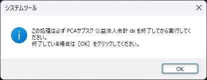 1. システムツールを実行する前に、『PCA 公益法人会計シリーズ』が終了していることを確認してください。