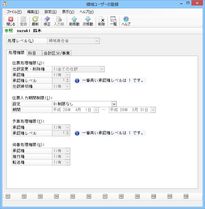領域ユーザーに対して、処理レベルと処理可能な会計区分/事業、科目、その他の権利を設定します。