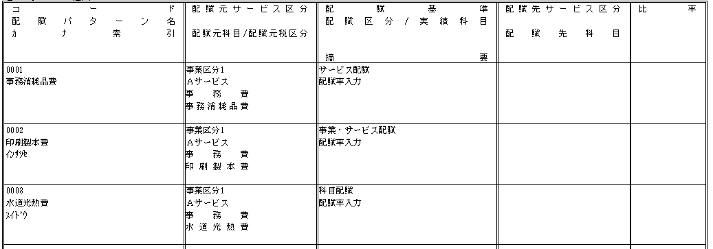 (3)「配賦パターンの登録」で科目配賦情報を以下のように設定します。