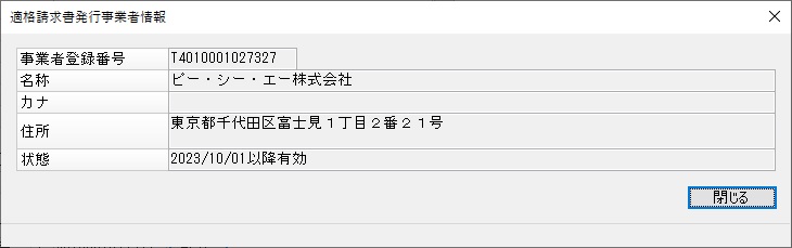 (1)  事業者登録番号欄に登録番号を入力した状態で[確認]ボタンをクリックすると、「適格請求書発行事業者情報」画面が表示されます。