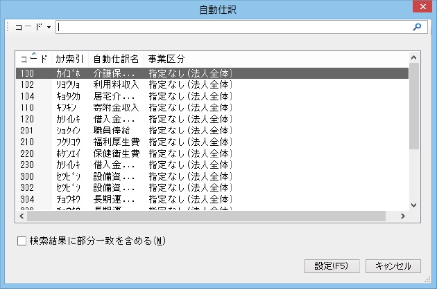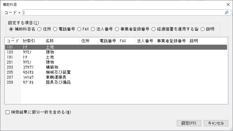 中科目、小科目、補助科目、サービス区分、摘要文、自動仕訳、予約伝票、伺書パターンも同様の操作です。