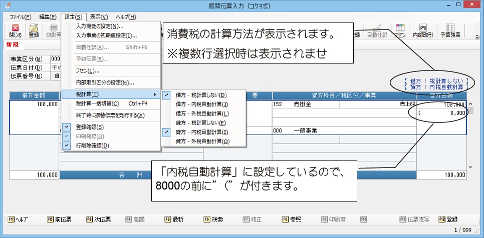 これを電卓機能と呼んでいます。フォーカスが借方・貸方金額欄、借方・貸方消費税額欄にあるときに、キーボードの[+][-][*][/]キー、または[F8]キーを押すと、電卓機能を使用することができます。