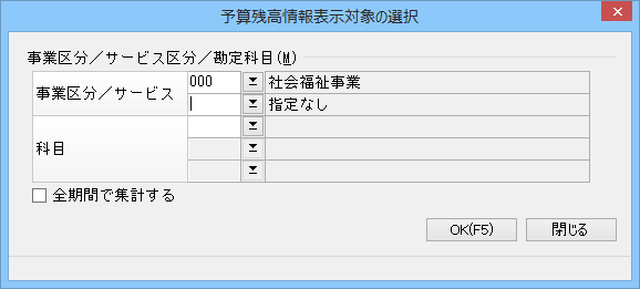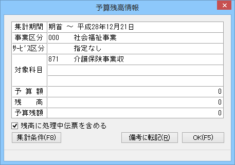 • 集計期間 : 予算残高の集計期間が期首日から期末日までの場合は「全期間」、期首日から伝票日付までの場合は「処理中伝票まで」を選択します。