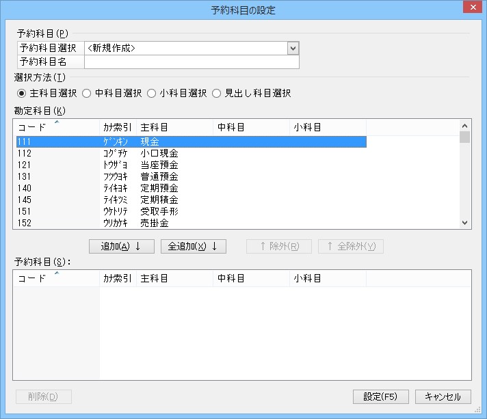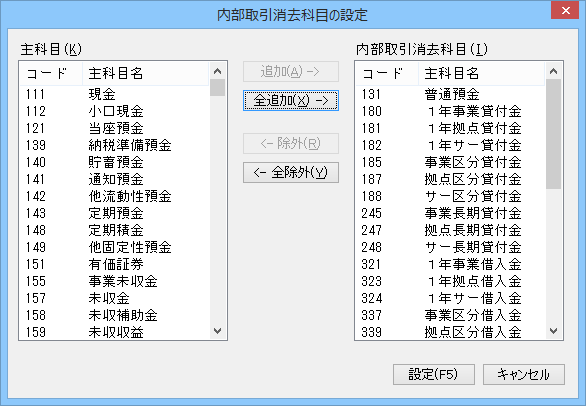 • 追加 : 内部取引消去科目に追加する主科目を選択し、[追加]ボタンをクリックします。