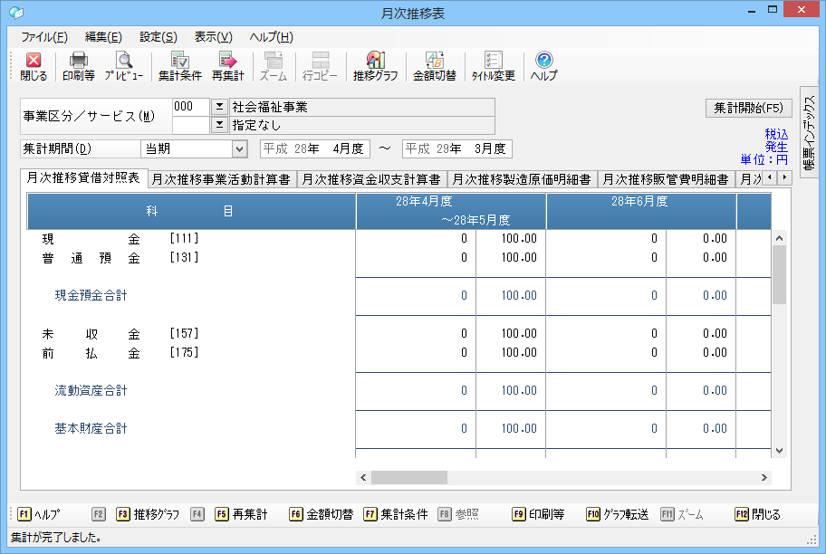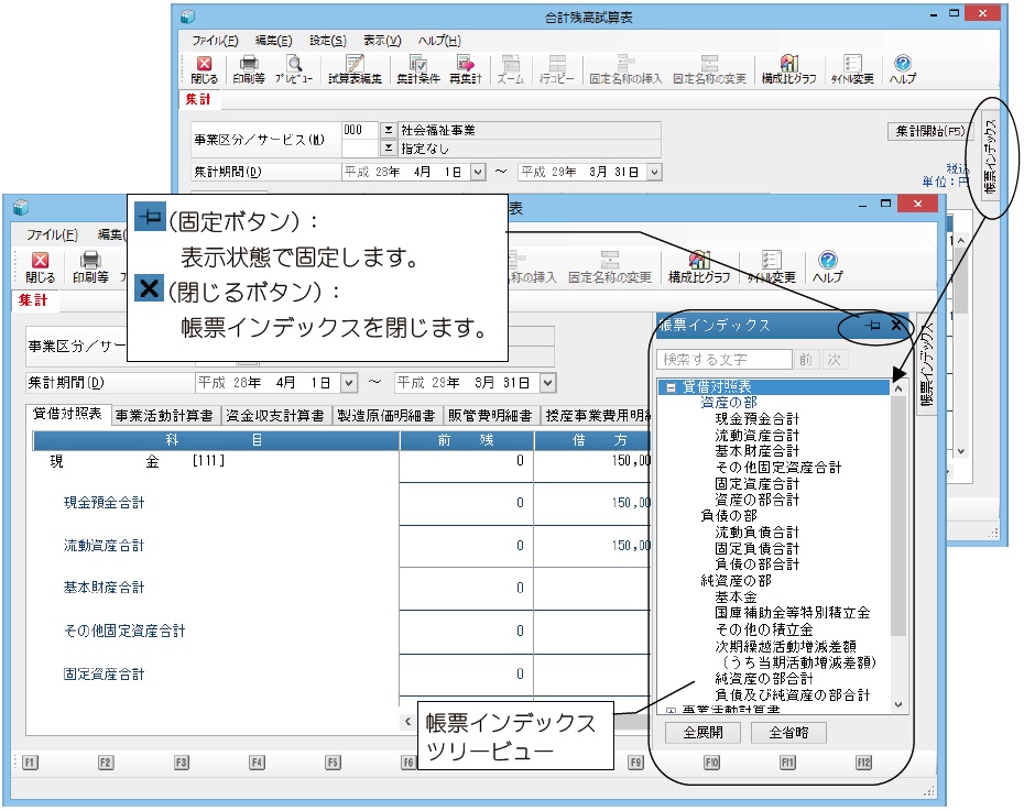 • 「日常帳票」-「合計残高試算表」「予算付合計残高試算表」
