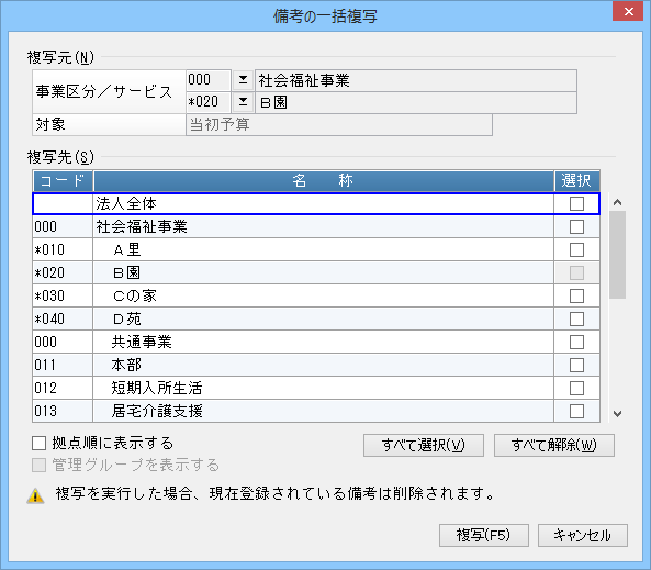 設定した備考の内容を他の事業区分/サービス区分にコピーすることができます。