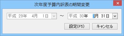(1)  メニューバーの「設定」-「次年度予算内訳表の期間変更」をクリックすると、「次年度予算内訳表の期間変更」画面が表示されます。