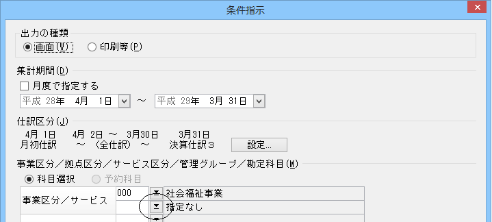 ここでは、「日常帳票」-「総勘定元帳」の「条件指示」画面でサービス区分を指定する場合を例に挙げて説明しています。