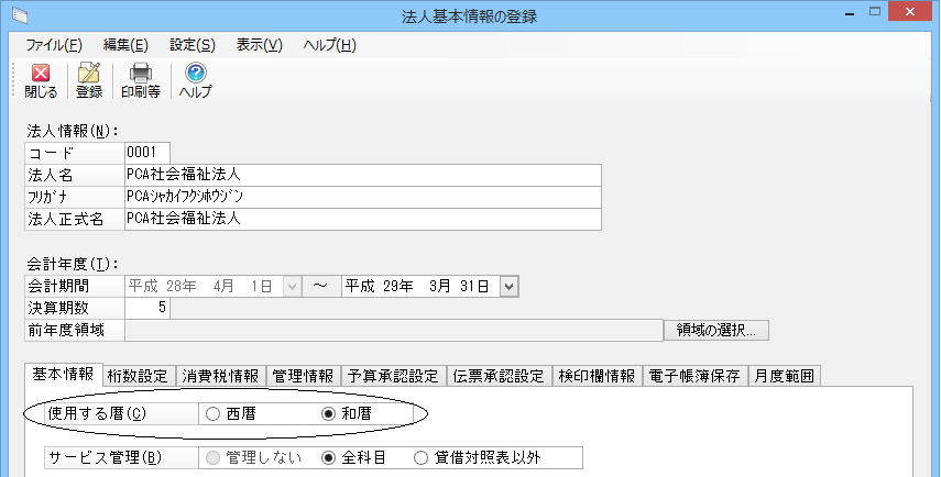 使用する暦は「前準備」-「法人基本情報の登録」-「基本情報」タブで「西暦」「和暦」のいずれかを選択します。
