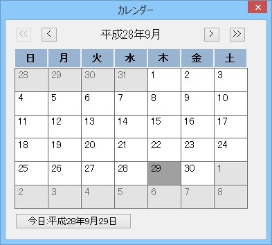 入力欄横のボタンをクリックするか、入力欄にフォーカスがある状態で、[F8]キーを押すと、「カレンダー」画面が表示されますので、日付を選択して[Enter]キーを押すか、日付をダブルクリックしてください。