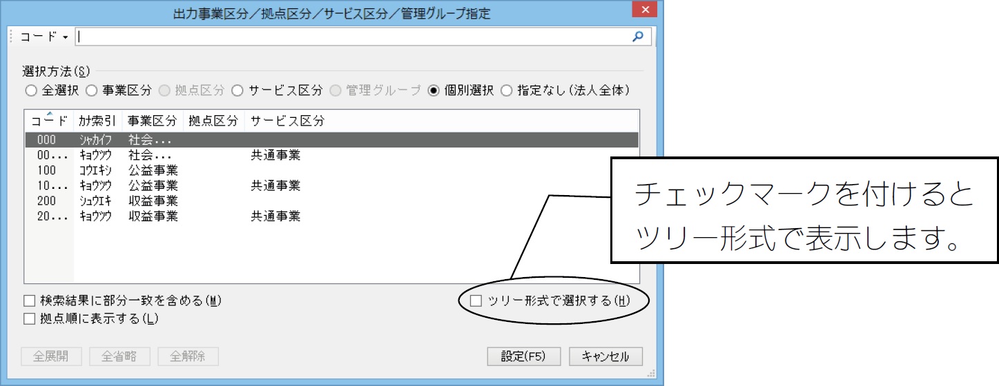 • 個別選択:集計する事業区分サービス区分などを選択します。