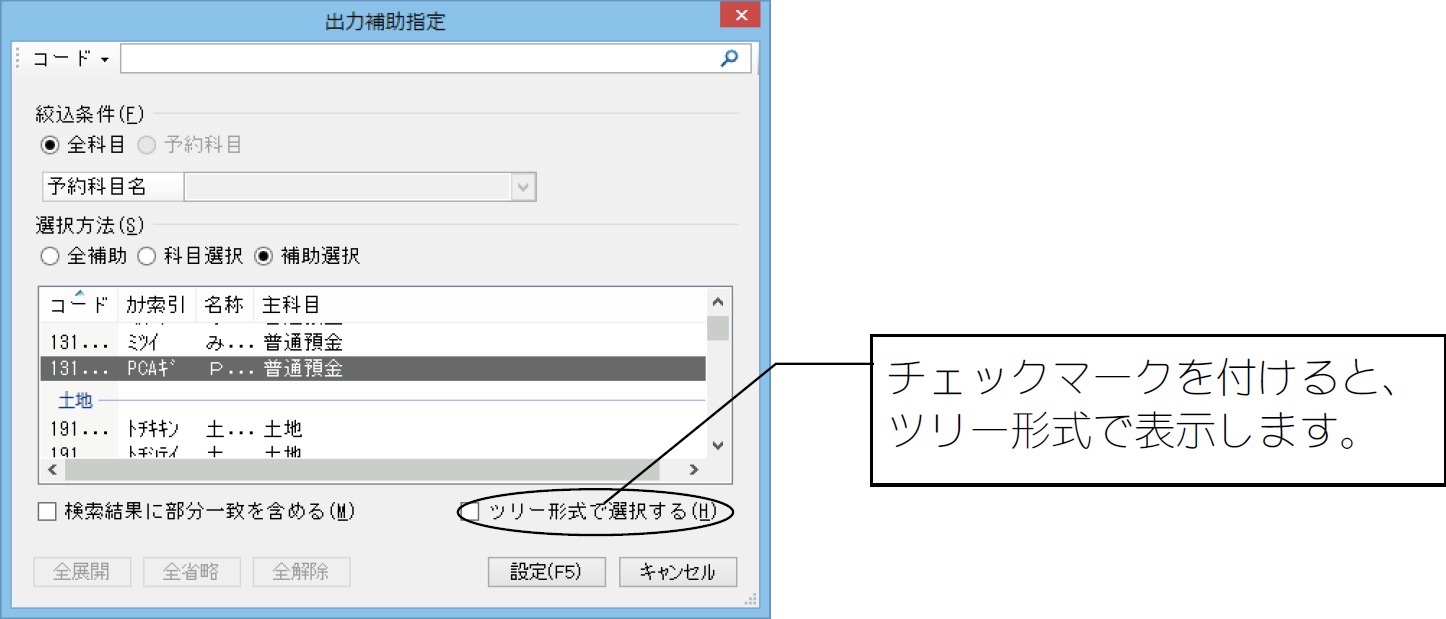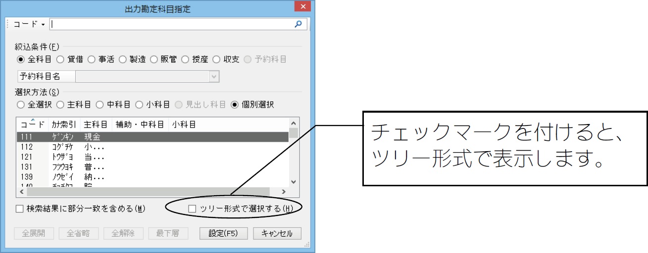 • 主・補助・中・小・見出し科目:それぞれ主・補助・中・小・見出し科目のみ、絞り込んで表示します。