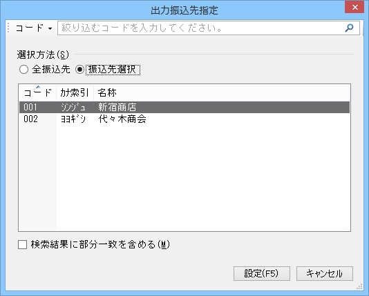 ボタンをクリックすると、「出力振込先指定」画面が表示されますので、「選択方法」を以下から選択します。振込先を選択後、[設定]ボタンをクリックします。