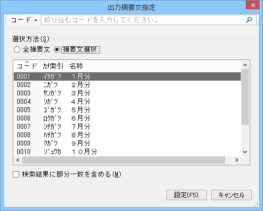 ボタンをクリックすると、「出力摘要文指定」画面が表示されますので、「選択方法」を以下から選択します。摘要文を選択後、[設定]ボタンをクリックします。