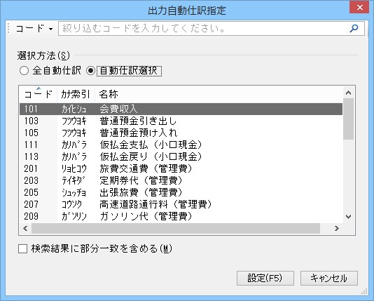 ボタンをクリックすると、「出力自動仕訳指定」画面が表示されますので、「選択方法」を以下から選択します。自動仕訳を選択後、[設定]ボタンをクリックします。