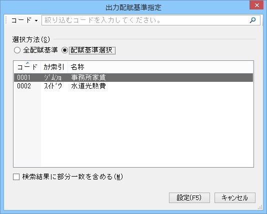 ボタンをクリックすると、「出力配賦基準指定」画面が表示されますので、「選択方法」を以下から選択します。配賦基準を選択後、[設定]ボタンをクリックします。