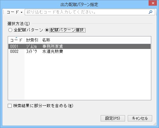 ボタンをクリックすると、「出力配賦パターン指定」画面が表示されますので、「選択方法」を以下から選択します。配賦パターンを選択後、[設定]ボタンをクリックします。
