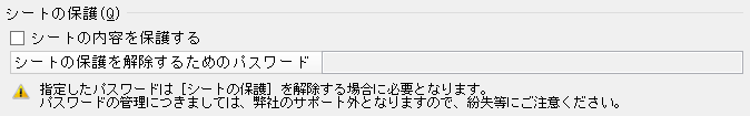 • 指定したパスワードは[シートの保護]を解除する場合に必要となります。パスワードの管理につきましては、弊社のサポート外となりますので、紛失にご注意ください。