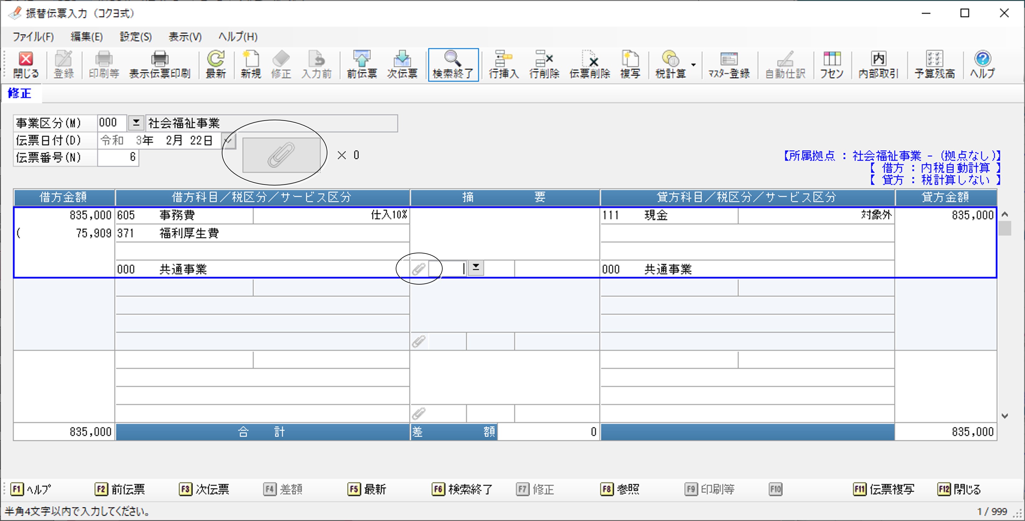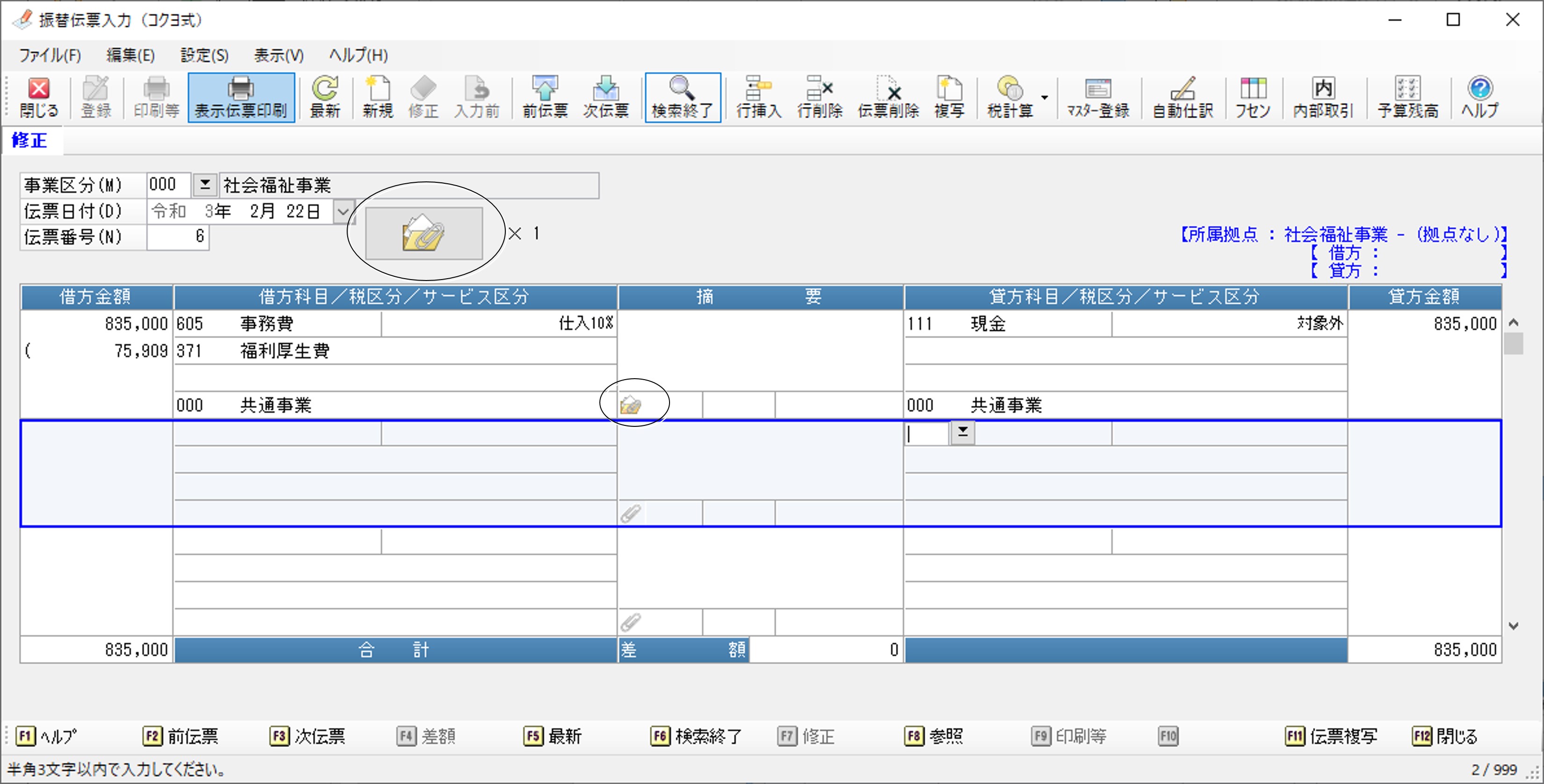 • 編集可能な伝票とは、「領域ユーザーの登録」で設定が可能な入力・参照ロックのある科目、事業区分/サービス区分を使用していない伝票を意味します。