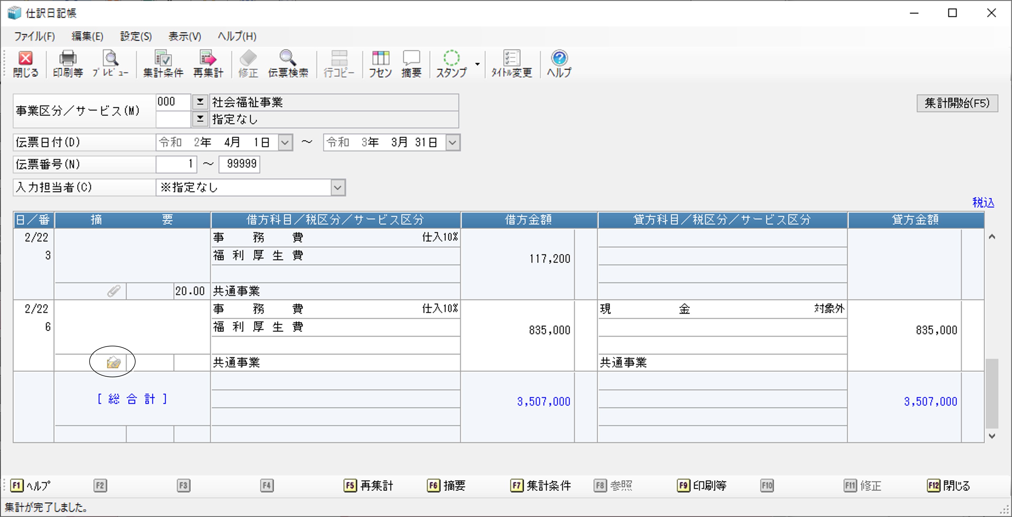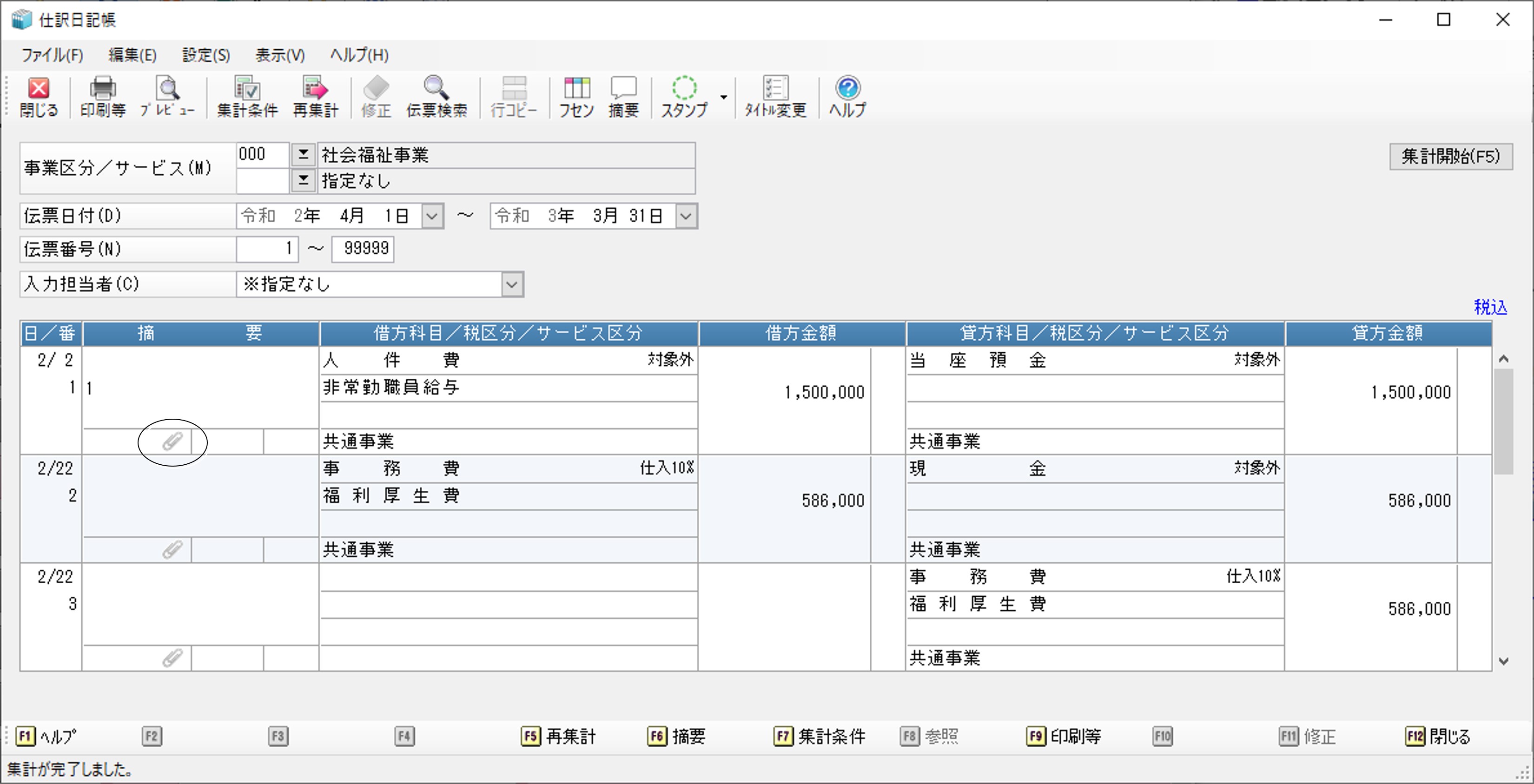 ドキュメントファイルが関連付けられている仕訳は、ドキュメントが挟まっていてクリップが付いたファイルが表示されています。